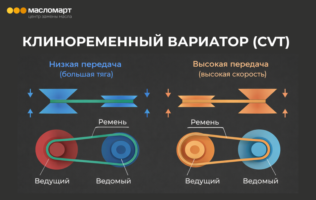 В основе бесступенчатой трансмиссии лежат два раздвижных конуса (шкива), между которыми натянут металлический ремень или цепь. Задача специальной жидкости (CVTF) — не только отводить тепло. Главная цель — создавать микроскопическую пленку с уникальными модификаторами трения.