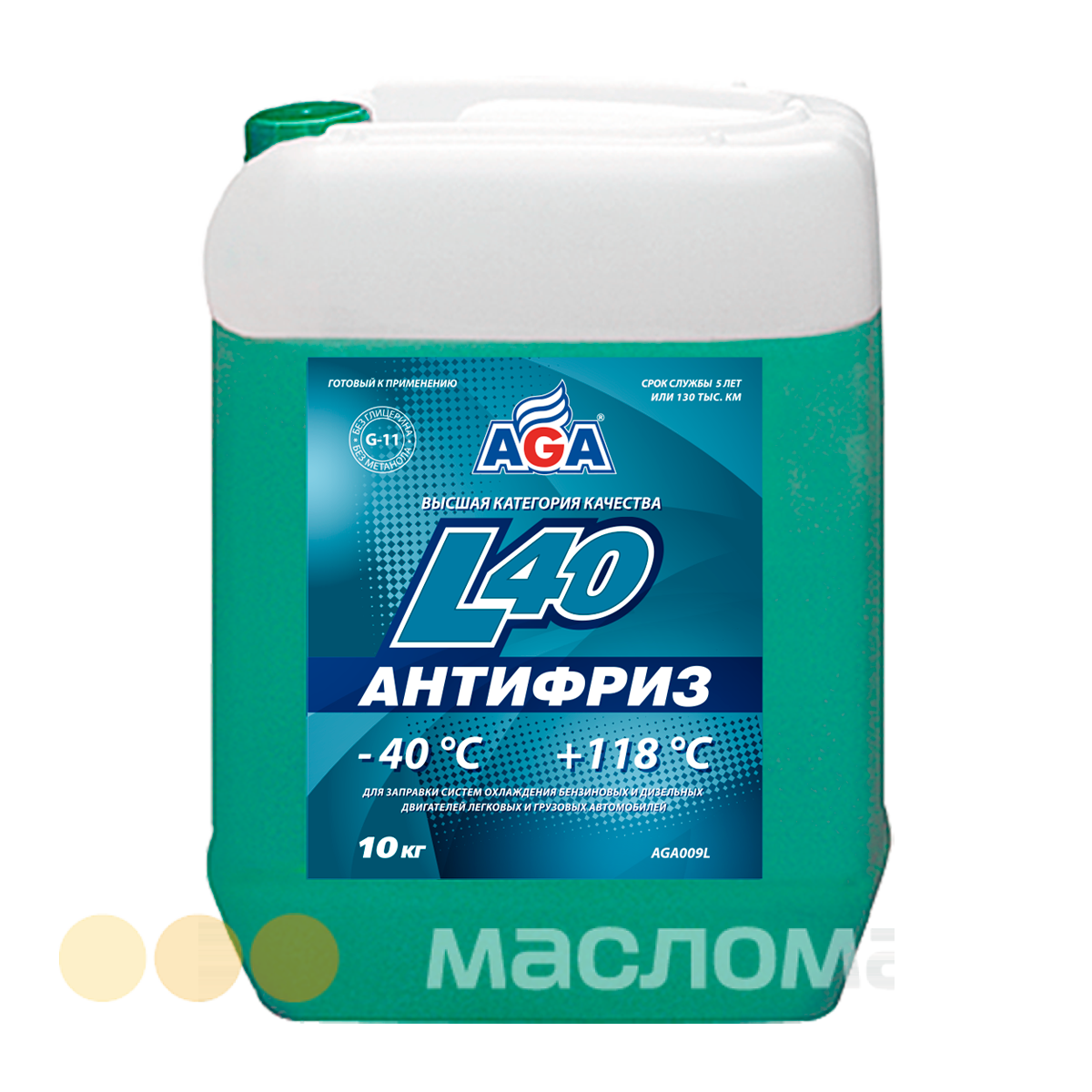 Антифриз AGA-L40, готовый к применению. Обеспечивает Эффективную работу системы охлаждения в диапазоне от -40 до +118 °С (под давлением) без смены антифриза до 5 лет или 130 тыс. км пробега. Высокую защиту головки и блока цилиндров от коррозии и кавитации. Превосходную защиту резиносодержащих элементов от растрескивания.